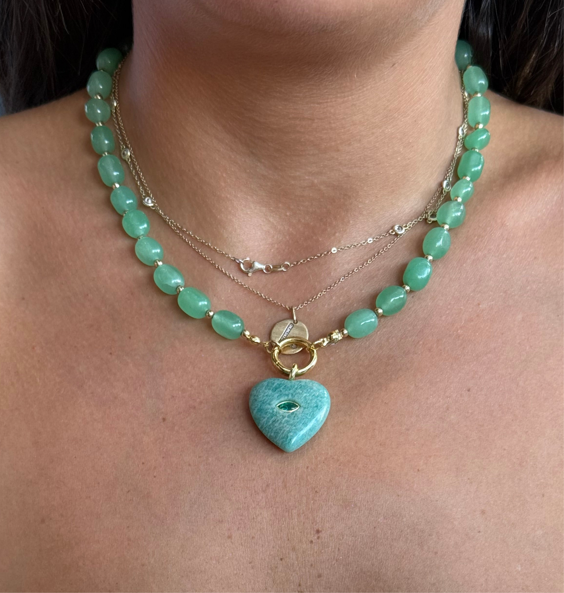 Agate mixed with Gold for a luxury feel This sea glass necklace features agate green beads, gold accents, and a heart charm with an eye motif. The green beads and gold touches add a touch of elegance, while the eye charm brings a unique and meaningful touch. Perfect for those who appreciate both style and symbolism.
